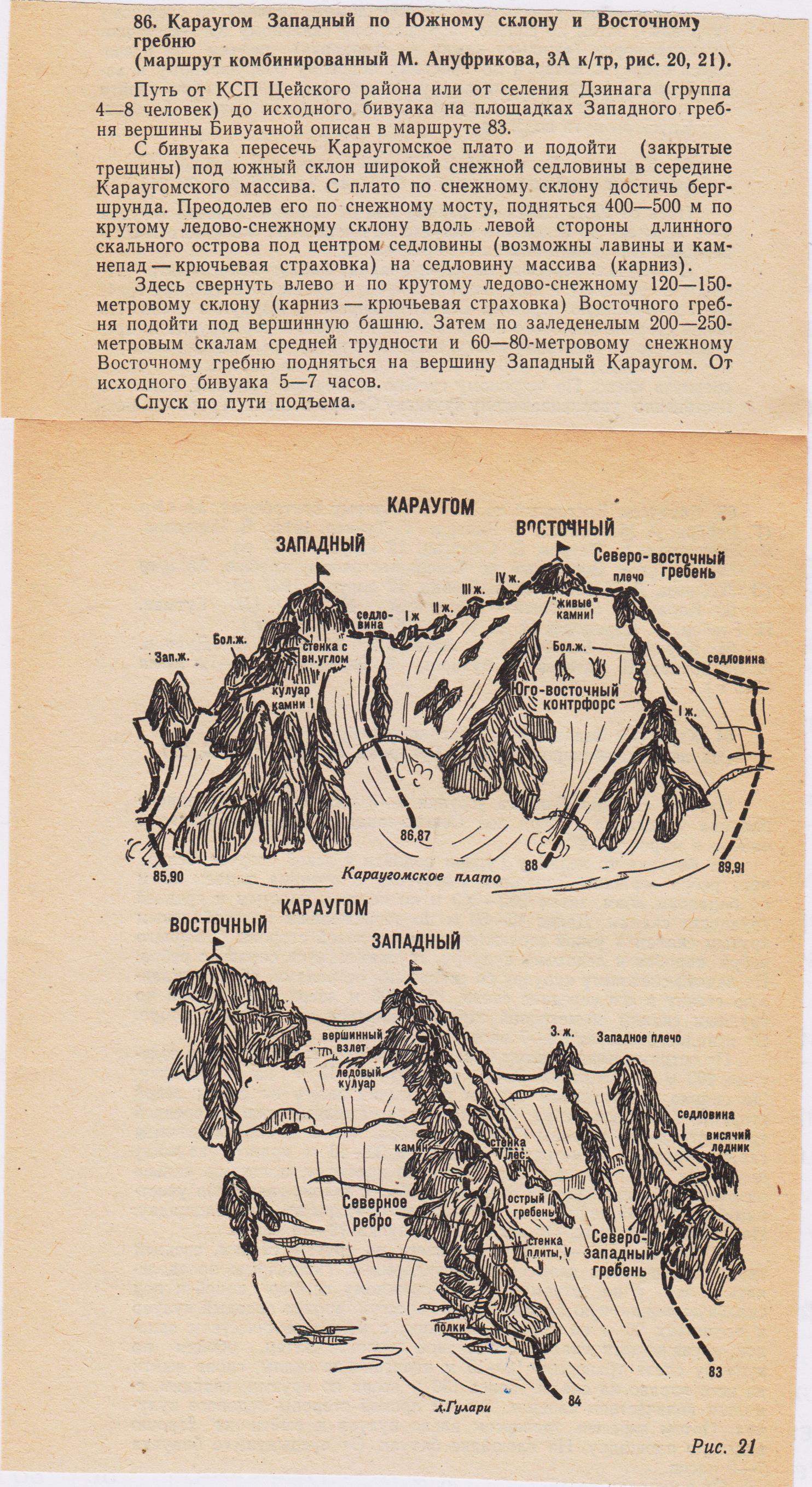 - Karaugom West via the South slope and the East ridge (combined route by M. Anufrikov, 3A category of difficulty, fig. 20, 21). The path from the CSP of the Tsey region or from the village of Dzanaga (group of 4-8 people) to the initial bivouac on the platforms of the West ridge of the Bivouacnaya peak is described in route 83.